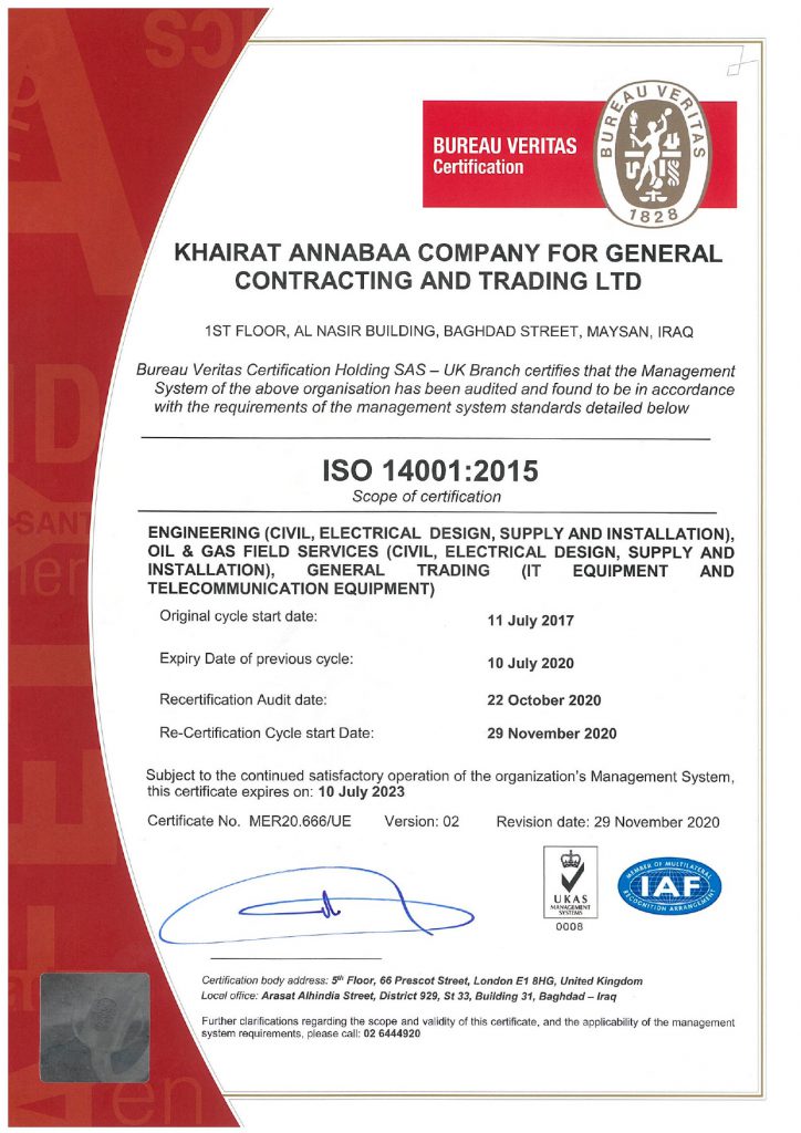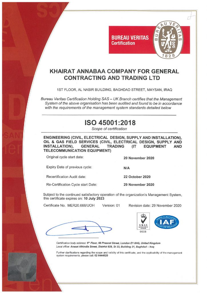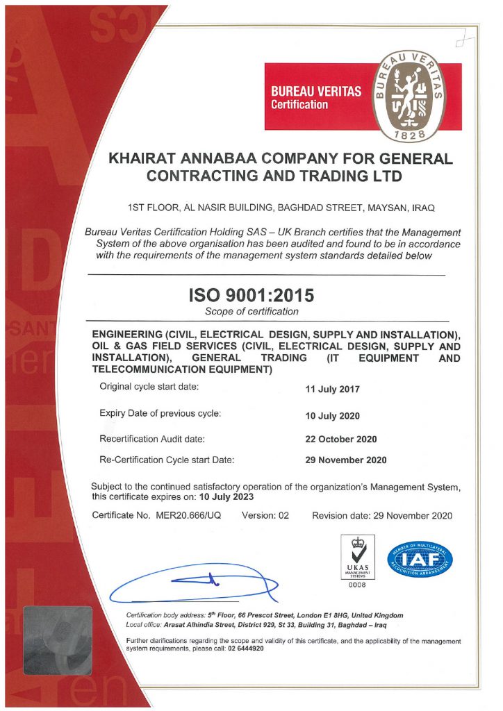 KAC LTD is certified by (ISO 9001:2015), Environmental (ISO 14001:2015), Occupational health and safety management (ISO 45001:2018) it from BUREAU VERITAS and approved from UKAS and IAF. KAC LTD specializes in several activities, including the following:
